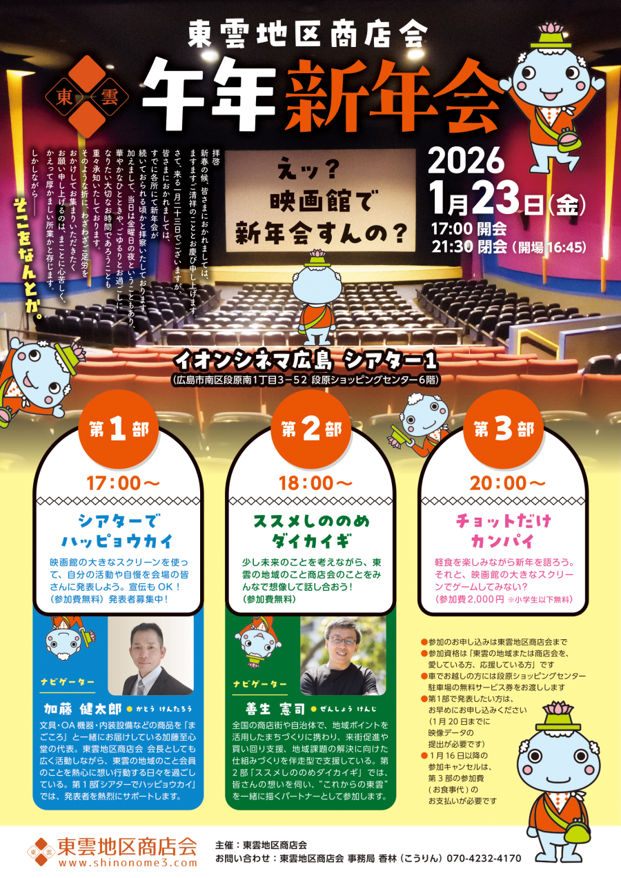 映画館で新年会をします。1月23日金17時開始です。盛大に盛り上げ、存分に楽しんでいただける企画をご用意します。 東雲を愛している方、応援している方ならどなたでもご参加になれます。 では、皆さまのお申し込みをお待ちしております。 参加申し込みは、東雲地区商店会まで!