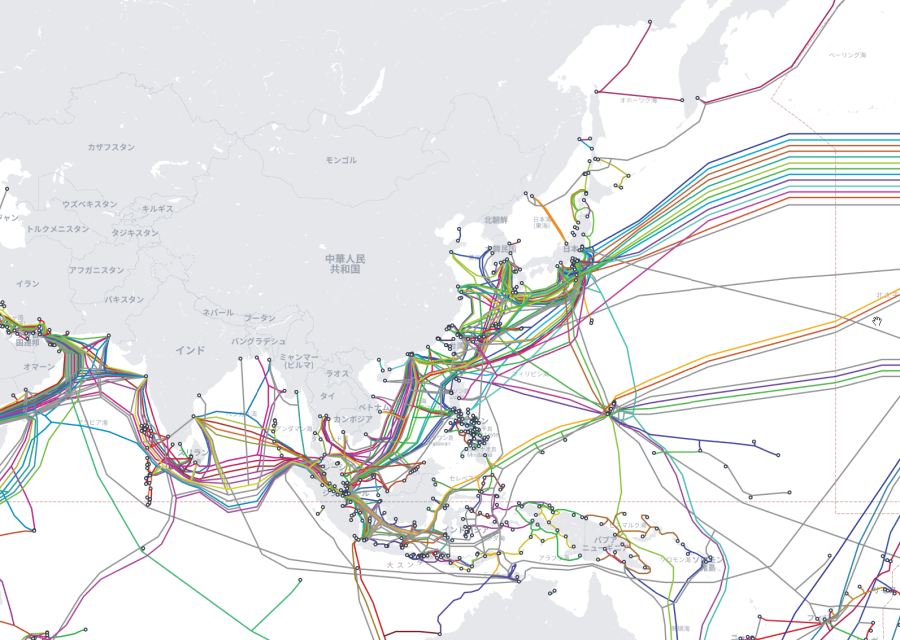 日本を中心としたこの地図。カラフルな線がたくさん描かれています。さて、この地図はいったい何を意味していると思いますか? 正解は「海底ケーブル」です。 電話やインターネットで電気通信を行うためのものです。 古いものは明治時代に作られたらしい。